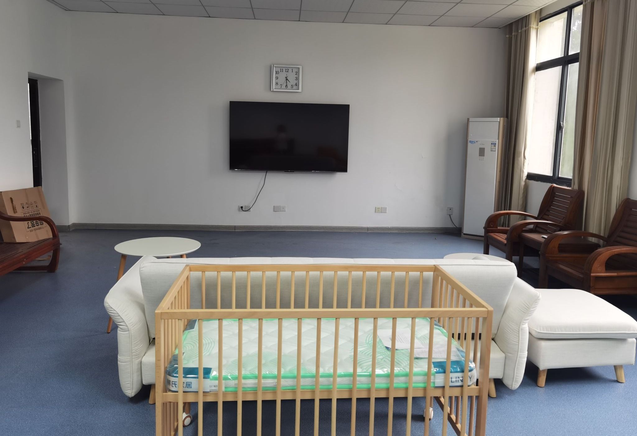 12、阳光家园--母婴室(二楼),为女教职工交流,心理辅导,插花、手工制作等培训和哺育的综合场所。安装网络电视收看新闻、体育和娱乐节目。(在建)