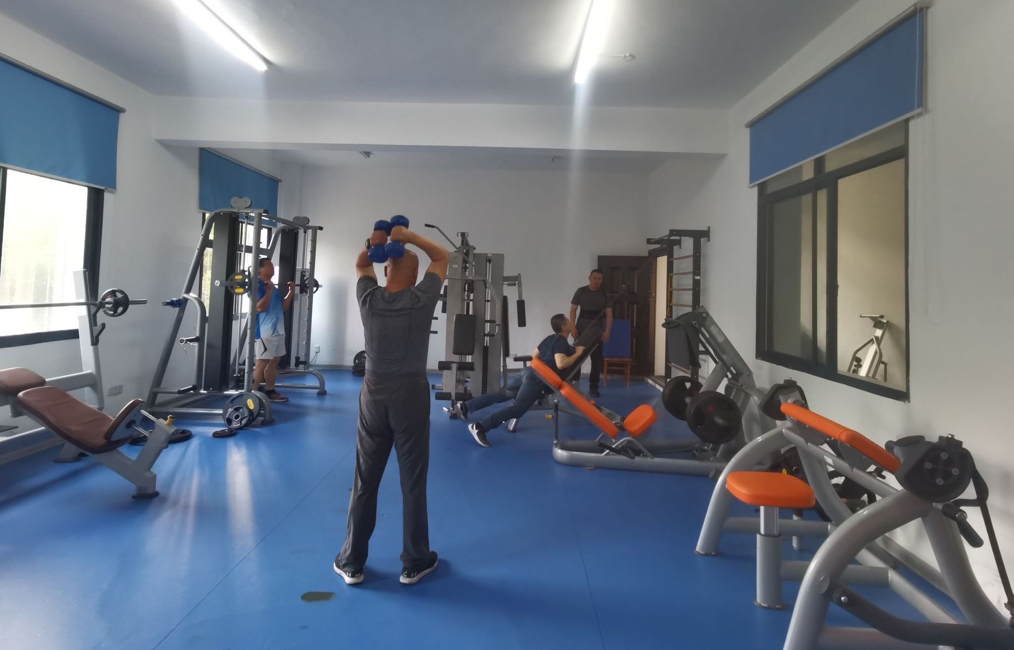 3、健身房(一楼),配有跑步机、甩脂塑身机、立式磁控健身车、商用椭园机、卧式上斜推举训练器、五站二重训练机、磁阻力划船器、史密斯机等全身性健身器械、局部性健身器械、小型健身器械等 ,可以满足各种健身之需要。