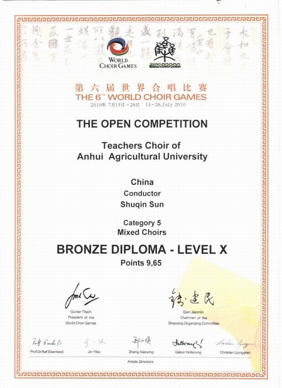 2010年7月安徽农业大学教工合唱团荣获第六届世界合唱比赛混声合唱铜奖