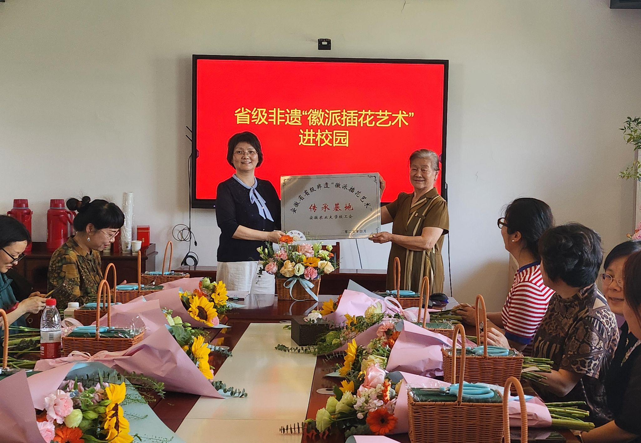 活动上,安徽省省级非遗项目“徽派插花艺术”传承团队还授予我校省级非遗“徽派插花艺术传承基地”称号。活动现场举行了授牌仪式,付玉兰教授和校工会主席共同为传承基地揭牌。(文/姬惠惠 图/钱杰 刘兵 编辑/薛美霞 预审/赵智 审核/姚莉)