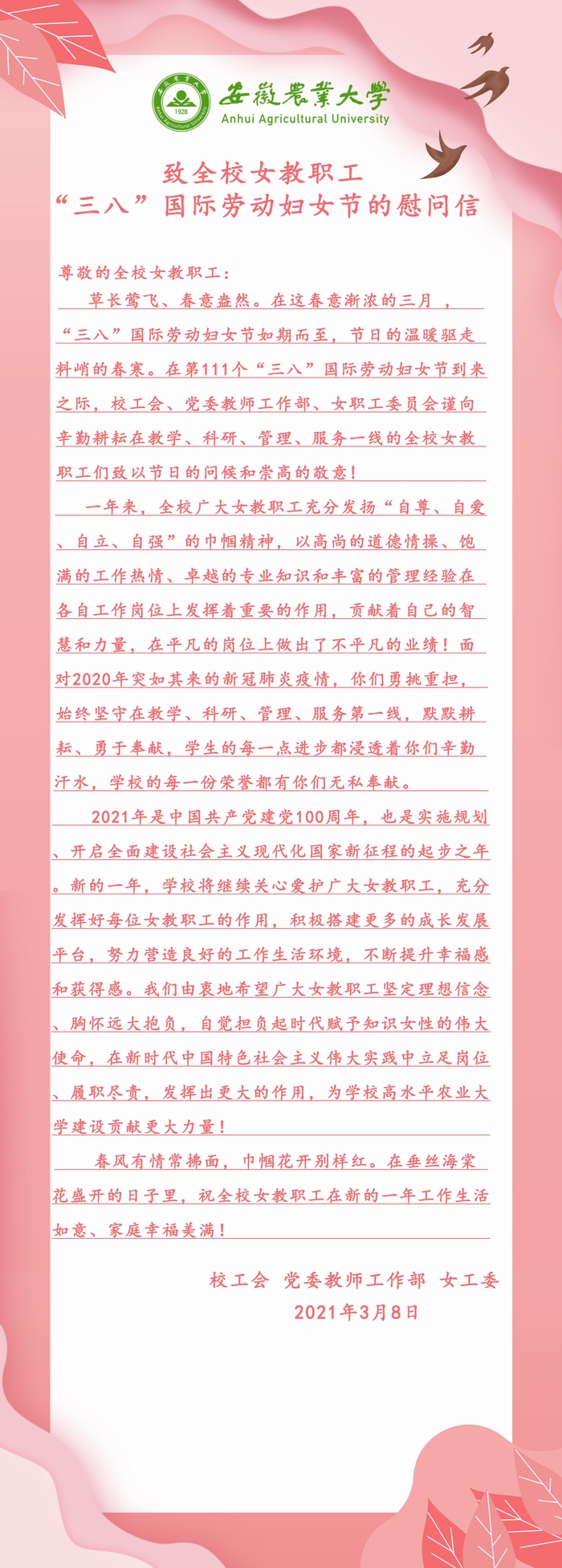 上一条:校领导“三八”妇女节走访慰问我校女教职工 下一条:校工会举行2020年度“书香三八”征文活动颁奖仪式