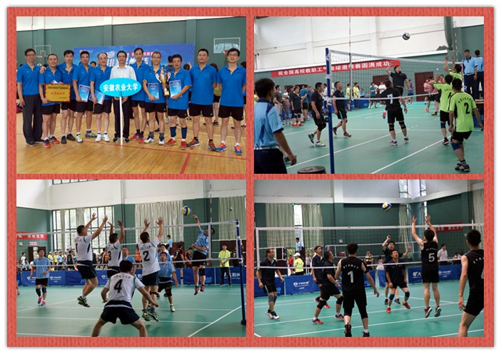 我校教职工男子气排球队在学校领导及有关部门的大力支持之下,队员们利用工作之余时间积极备战,力求以最佳的水平和状态投入比赛。赛场上,队员们勇于拼搏、配合默契、团结一致,凭借精湛的个人技术和熟练的团队配合,战胜一个个对手挺进八强,最终获得男子组第六名。比赛期间,安徽省教科文卫体工会凤桦主席、唐成副主席,安徽农业大学教育工会张久辉主席亲临赛场,为队员们加油鼓劲,增添了温暖与力量。