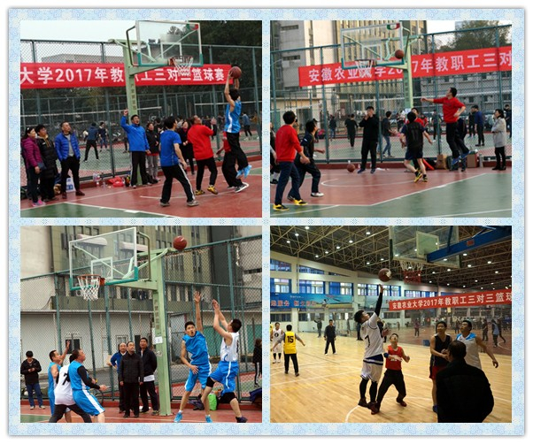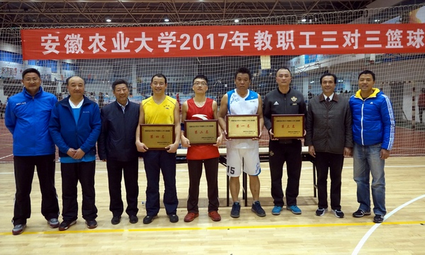 本网讯 11月29日下午,安徽农业大学体育馆篮球场地教职工三对三篮球决赛扣人心弦。冠军争夺战场地硝烟滚滚,后勤集团工会一路领先,机关二工会紧追不舍。三、四名决赛场地笑语飞扬,在友谊交流中排定四强座次。随着裁判员一声终场哨音的吹响,我校2017年度教职工三对三篮球比赛顺利落下帷幕。