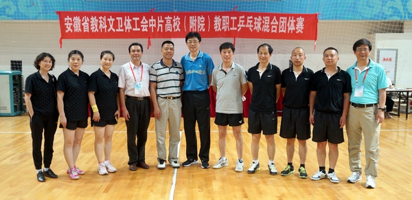 本网讯 6月23日,安徽省教科文卫体工会中片高校(附院)教职工乒乓球混合团体赛,在合肥学院落下帷幕。校党委常委、副校长韩军参加了比赛。