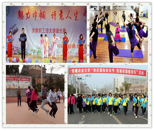 庆祝“三八”妇女节系列活动“品牌化”,美丽校园健步行活动、女教职工跳绳趣味活动、诗文诵读大赛、致全体女教工慰问信、发放节日慰问品等等活动精彩纷呈。举办摄影比赛,摄影展;举办征文比赛和读书交流会。2016年省“书香三八”读书活动中,我校女教师获征文类三个一等奖,三个二等奖,书画类优秀奖,学校获“优秀组织奖”的好成绩。海棠花女性沙龙活动“精品化”,分别以“谈女性颜值人生”、“阅生活 悦生活”、“寻幸福密码,做智慧女人”为题,引导女教职工热爱阅读、情趣高雅、健康生活。健身健美活动“常态化”,鼓励女职工参与体育活动,支持女职工健美协会、健身协会、气排球协会大众性活动。基层女职工活动“多样化”,部门工会女工组织贴近实际、贴近生活、贴近女性,活动形式多样,内容丰富如:暑期瑜伽培训班、心理讲座、成长教育讲座、环保生态考察、包粽子比赛、登山比赛等等。关爱行动“精准化”,建设女职工“阳光家园”,搭建女教职工交心互助平台,举办心理知识讲座、健康知识讲座、育儿经验分享等活动,开展泾县稼祥中学留守儿童关爱活动。女职工文明家庭建设“持久化”,青年女教工“亲子快乐行”一日游活动持续开展。