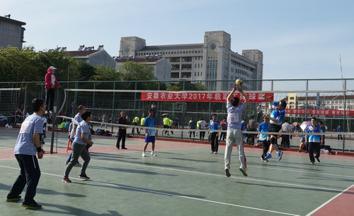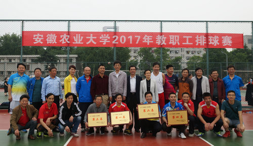本网讯经过半个多月的激烈比赛,2017年安徽农业大学教职工排球赛于5月3日圆满落下帷幕。在颁奖仪式上,本届比赛裁判长李宏宣布了比赛成绩,理学院代表队闪耀折桂,人文社会科学学院、机关二工会、机关三工会代表队分获二、三、四名。校党委常委、副校长韩军、校工会主席张久辉、体育部主任陈有忠、校工会副主席吴冬梅为获奖代表队颁奖。
