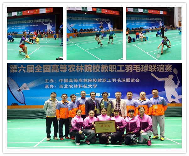 2016年10月13-16日,我校教职工羽毛球队参加了在西北农林科技大学举行的第六届全国高等农林院校教职工羽毛球联谊赛。来自中国农业大学、华南农业大学、华中农业大学、西北农林科技大学、南京农业大学、湖南农业大学、中南林业科技大学、江西农业大学、安徽农业大学、沈阳农业大学和江苏大学等11支代表队约180名运动员参加了比赛。本届比赛比赛采取抽签分组办法,分成2个小组和2个阶段比赛,第一阶段小组循环赛每队打满七场,第二阶段淘汰赛采用七场四胜制。11所高校代表队本着加强交流、重在参与的目的,经过两天紧张激烈的角逐,冠亚季军分别被沈阳农业大学、中南林业科技大学和西北农林科技大学夺得。我校代表队顽强拼搏,赛出了风格,赛出了水平,最终获得第七名的较好成绩。六载风雨羽球飞,顽强拼搏磨意志,联谊赛为全国高等农林院校教职工搭建了教学、科研、管理工作交流和切磋球技的平台,传播了友谊。