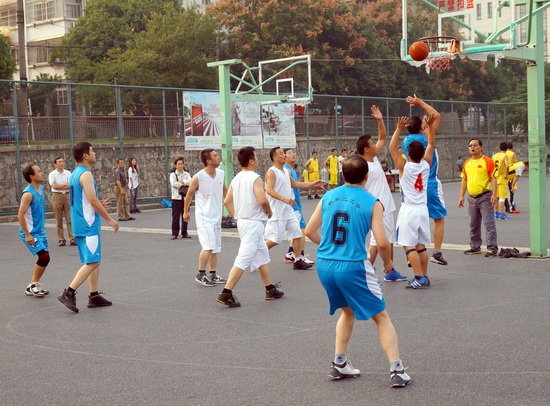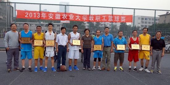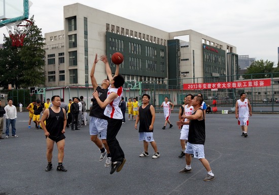 本网讯 10月11日下午,安徽农业大学第二运动场篮球场地教职工篮球决赛扣人心弦。冠军争夺战场地硝烟滚滚,后勤集团工会一路领先,机关二工会紧追不舍。另外三个决赛场地笑语飞扬,在友谊交流中排定八强座次。机关一工会女将孙蕾居然在男子汉林立的态势中勇获2分,纪委书记裴树东的一记精准远投更是引爆全场热烈掌声。随着裁判员一声终场哨音的吹响,我校2013年度教职工篮球比赛顺利落下帷幕。