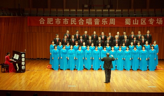 为贯彻落实学校十二五规划“大学文化建设工程”和党委宣传部校园文化建设实施意见,在校党政领导的关怀下,我校教职工合唱团坚持训练制度,积极参加演出,欢迎所有爱好歌唱艺术的教职工参加合唱团活动,凝聚了一批合唱艺术的爱好者与志愿者,成就了一批合唱曲目,在校内外的多次演出活动中经受锻炼,产生了较好的社会影响。本次蜀山区专场合唱活动,我校教职工合唱团是蜀山区唯一一所高校代表队,并被安排为最后一个节目隆重介绍和出场演出。