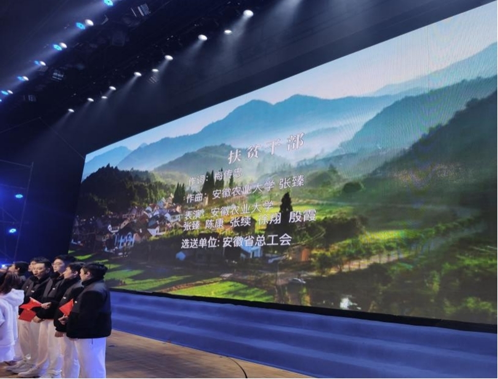 本网讯 2021年12月23日,由全国总工会、中央网信办联合举办的“网聚职工正能量 争做中国好网民”之“劳动颂歌献给党”专场总结展示活动在四川泸州举行,我校园艺学院张臻、农学院陈康、理学院张续、工学院徐翔、外国语学院殷霞五位老师代表安徽省总工会参演了音乐舞台剧《乡村振兴 强国有我》。此剧由安徽、重庆、辽宁三个地区的歌曲作品,精心编排打造而成,荣获“最佳表演节目”,剧情真实感人,歌曲优美动听,深受观众喜爱。