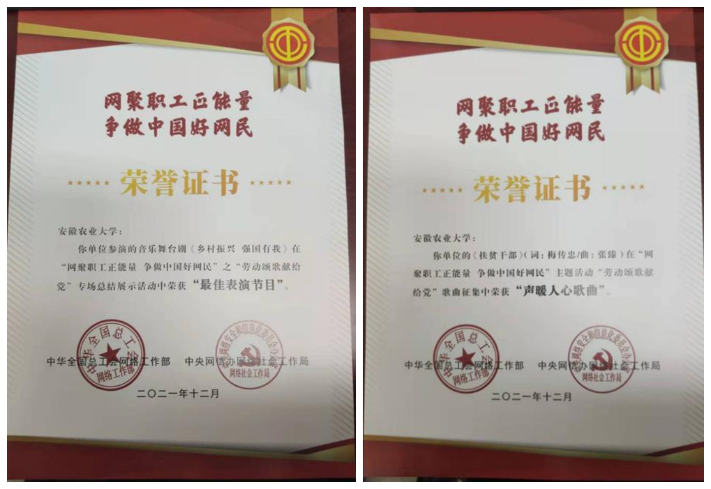 音乐舞台剧《乡村振兴 强国有我》其中原创歌曲《扶贫干部》由安徽农业大学张臻老师作曲,并在全国总工会全会歌曲征集中荣获“声暖人心歌曲”奖。