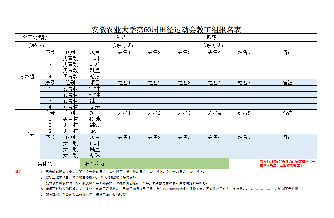 3.各分工会将报名运动员按组别、分项目统计填写《安徽农业大学第60届田径运动会教工项目报名表》(见附件),于10月10日(星期五)上午10:00前将纸质报名表报校工会,同时将电子件发工会信箱:gongh@ahau.edu.cn,逾期不予补报。