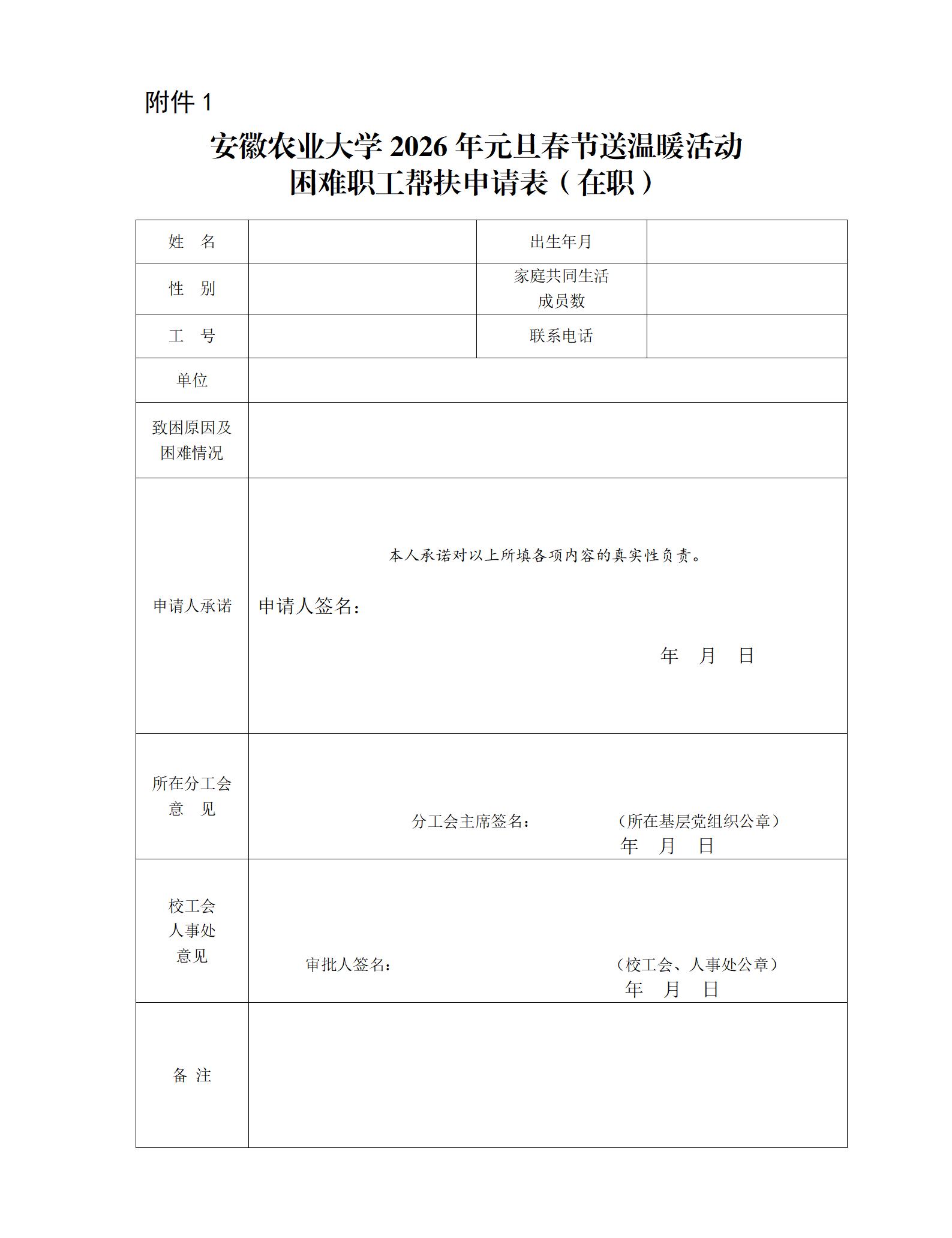 附件: 1.安徽农业大学2026年元旦春节送温暖活动困难职工帮扶申请表(在职)
