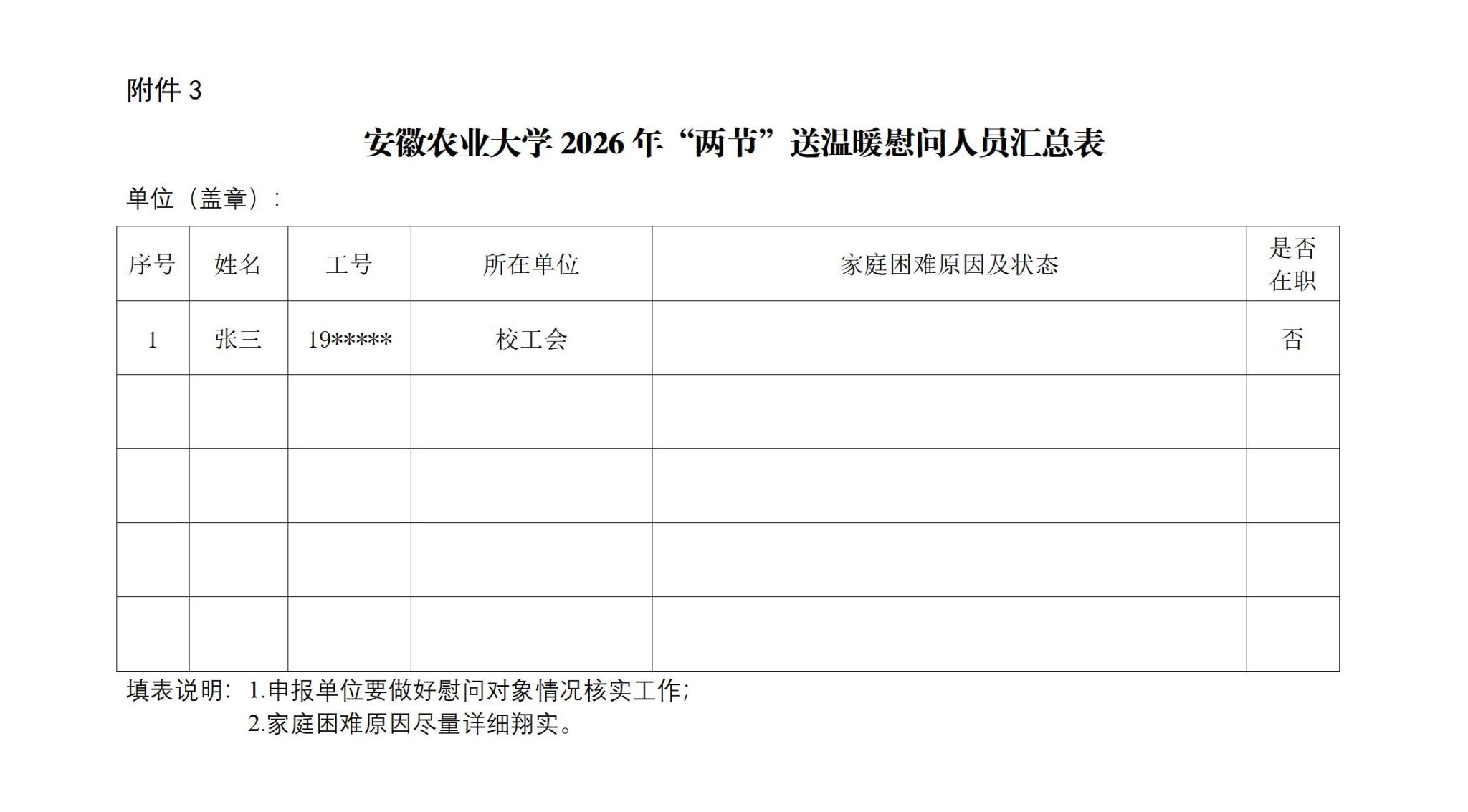 二、学校慰问的对象为学校工会会员和离退休教职工。各单位报送的慰问人员须填写《安徽农业大学2026年元旦春节送温暖活动困难职工帮扶申请表》(在职教职工填写附件1,离退休教职工填写附件2)和《安徽农业大学2026年“两节”送温暖慰问人员汇总表》(附件3)。申报材料须经所在二级党组织负责人和分工会主席签字确认,并加盖基层党组织公章。