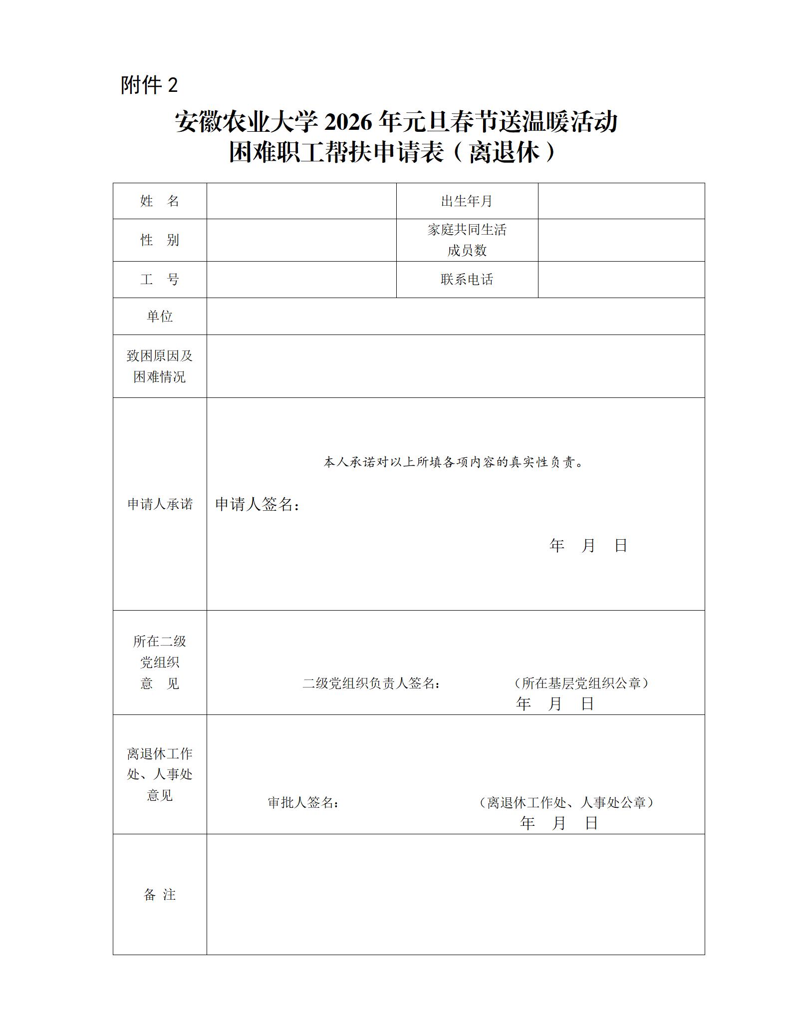 2.安徽农业大学2026年元旦春节送温暖活动困难职工帮扶申请表(离退休)