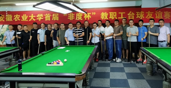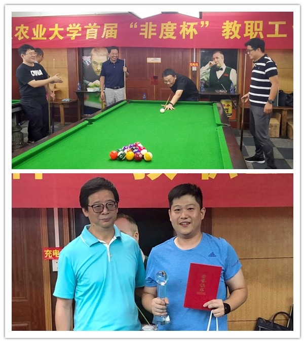 本网讯 9月28日,为庆祝中华人民共和国成立70周年,校教职工台球协会携手合肥非度信息有限公司举办了“非度杯”首届台球友谊赛。我校校友、合肥非度信息有限公司董事长、校教职工台球协会名誉会长姚国龙为比赛开球。校教职工群众社团管委会秘书长李海峰为获奖选手颁奖。