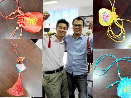男女教工各显身手,互相切磋,相互取经,一针一线,精细缝制,半个小时左右,一个个象征着健康、平安的香包制作完成,象征着传统文化和民间技艺在今天的传承。