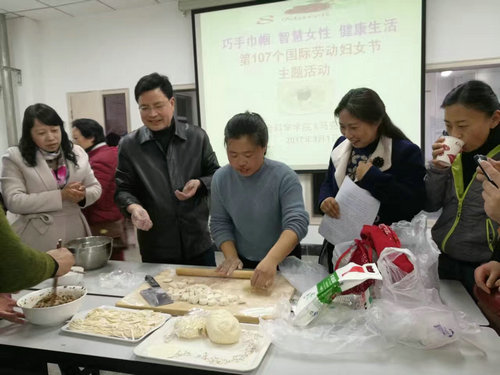 活动邀请了学院徐晓波老师为大家现场教授擀面条、擀面皮、包饺子,展示面食“绝活”,活动不仅吸引了30多位女教工参加,不少男教工也纷纷前来学习,学院书记、工会主席孙超亲临现场,为女教工送来祝福。徐老师耐心的给大家指导如何制作面条、饺子皮,大家争先恐后地要露一手,各种形状的饺子摆在我们的面前,迎来了阵阵赞许,活动在一场饺子宴中结束,传递了大家彼此的祝福!大家收获了手艺,传递了祝福,品尝着幸福!这是一次非常值得回味的活动,健康生活,来自巧手,祝福明天的生活更加美好!