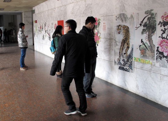 书画展出的首日虽是星期天,前来参观的师生接踵而至,参观者为学校举办纪念毛泽东诞辰120周年的书画活动感到欣慰。资源与环境学院原党委书记夏祖和同志在观看书画展后感慨万千,当场赋诗一首:“主席诞辰书画展,高雅纪念铸新篇;吃水不忘掘井人,师生情怀四海赞”。学生们在观看书画展的同时还三三两两地对书画作品形式、内涵进行欣赏和评论,不少观赏者还拿起相机或手机进行拍照留念。