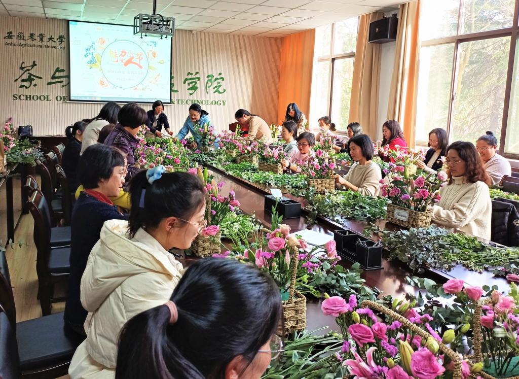 本网讯 为庆祝“三八”妇女节到来,3月7日,茶与食品科技学院在茶业楼举办插花培训活动。校党委常委、副校长李红出席本次活动,和学院女教工们一起共度节日。