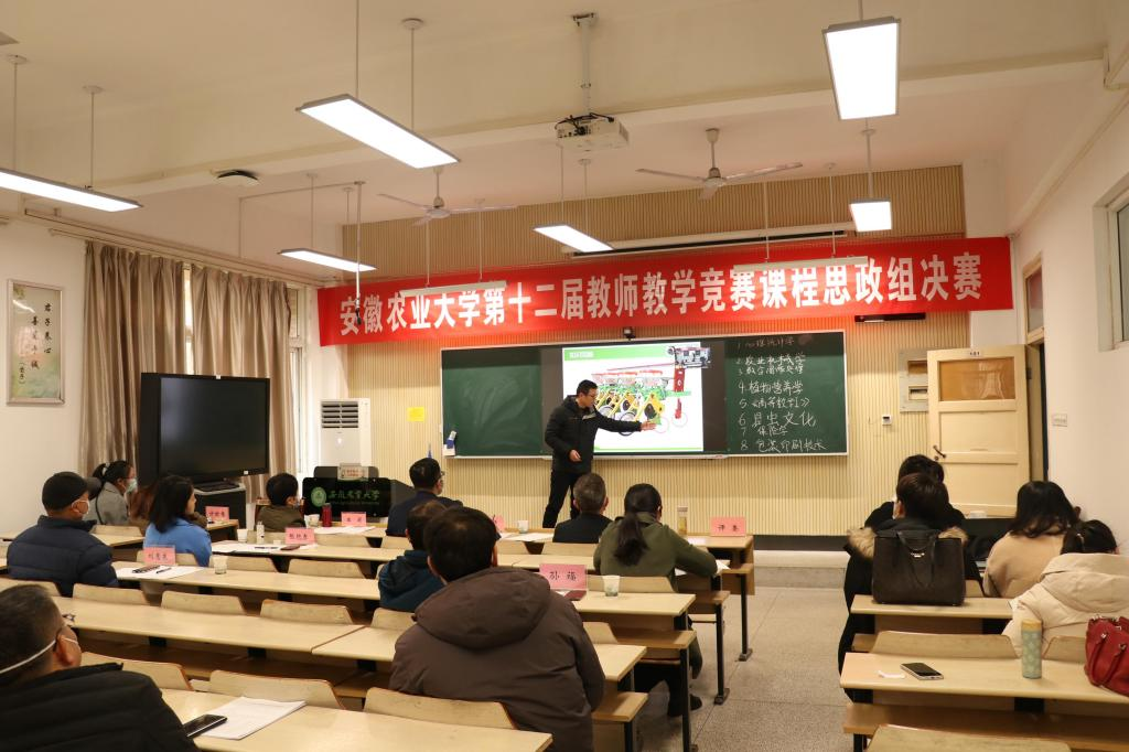 为深入学习贯彻习近平总书记关于教育的重要论述,落实立德树人根本任务,推动课程教学改革,增进相互间学习和交流,促进教师更新教育理念、改进教学方法和手段,提高教学质量,2022年12月11日下午,安徽农业大学第十二届教师教学竞赛课程思政组决赛在马克思主义学院101智慧教室举行。本次竞赛同时通过腾讯会议进行线上观摩。