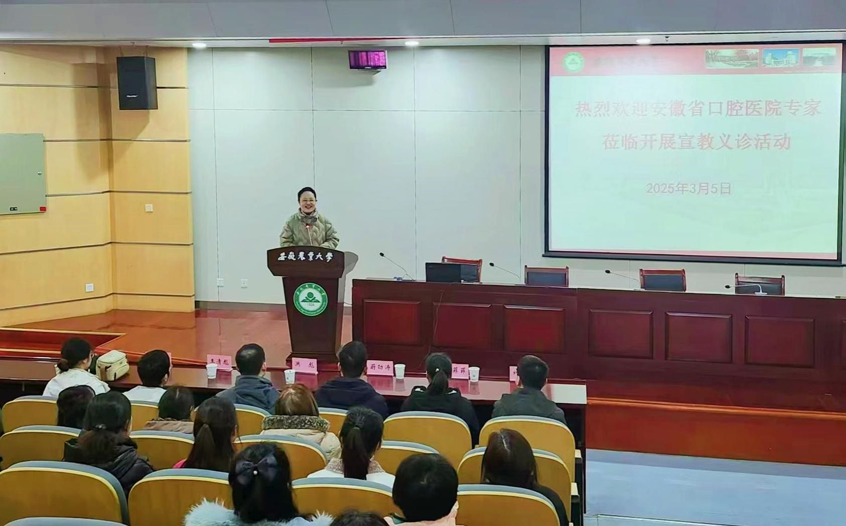 本网讯 为迎接“三八”国际妇女节的到来,关爱师生口腔健康,3月5日,校工会、总务部联合安徽省口腔医院,在“学雷锋纪念日”这一特殊日子,举办了一场爱与奉献同行的口腔健康义诊活动。校党委常委、副校长李红出席活动并致辞,省口腔医院专家面向教职工开展口腔健康知识讲座和义诊活动。